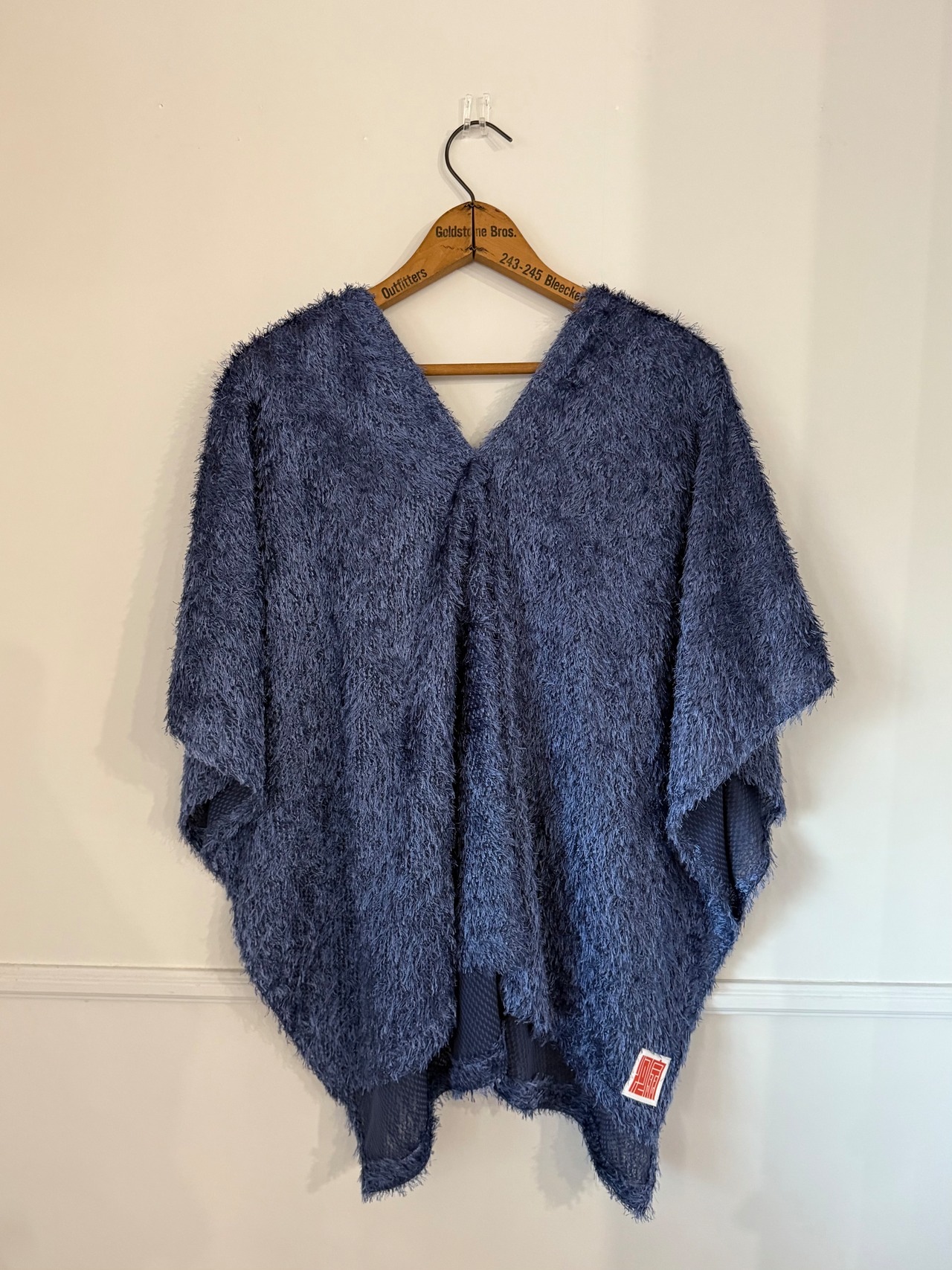 パープルのオーガンジーの布地に光沢のある同色の毛足の長い繊維がついています。ドレッシーな素材でとても高級感があります。シーズンレスで着れるアイテムです。