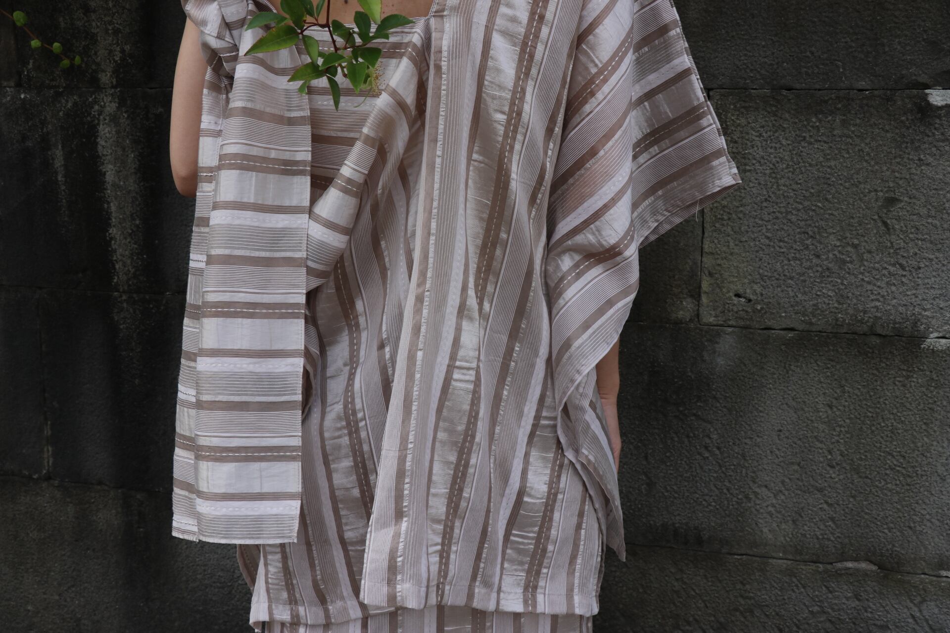 こちらは白×ベージュの光沢のあるストライプの楽衣です。すこし透け感があります。