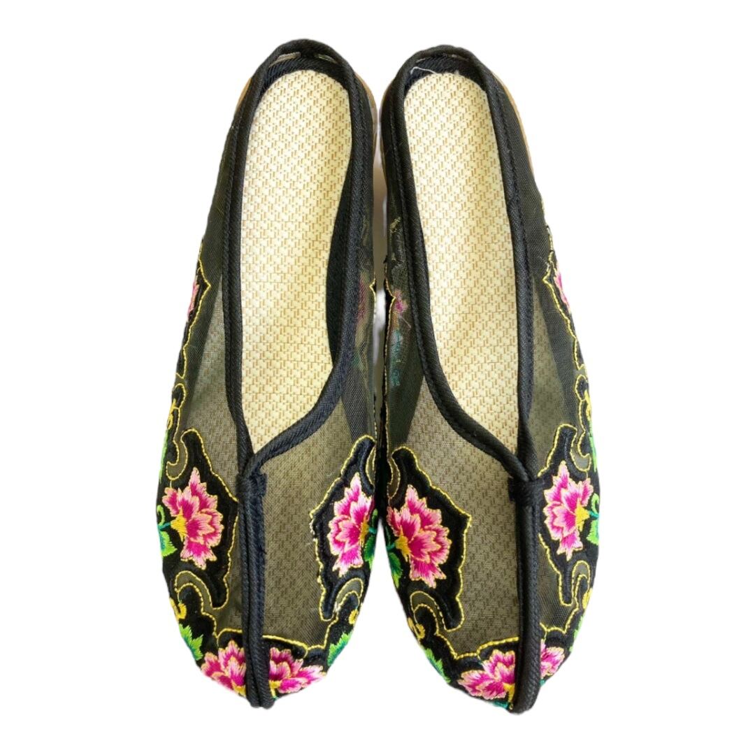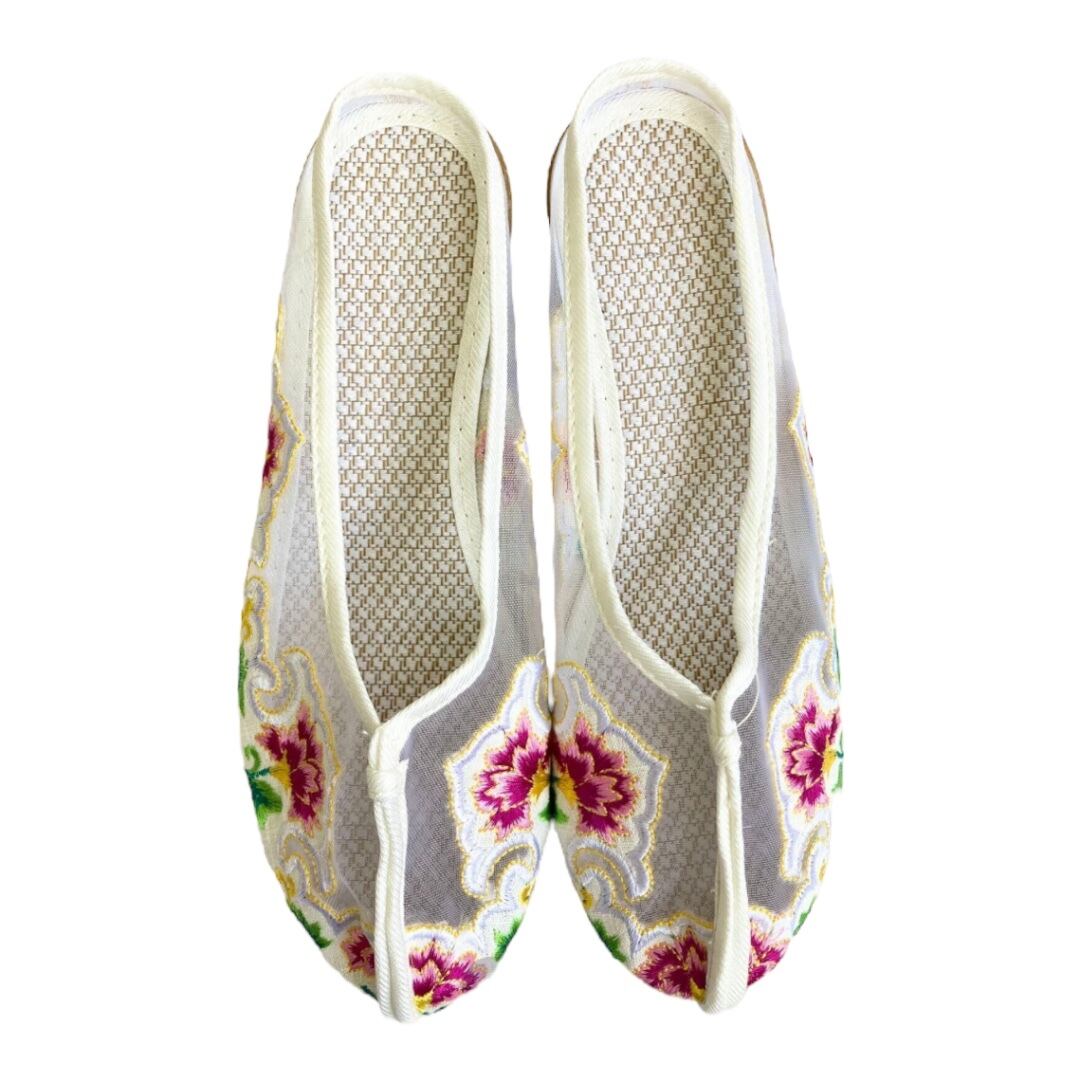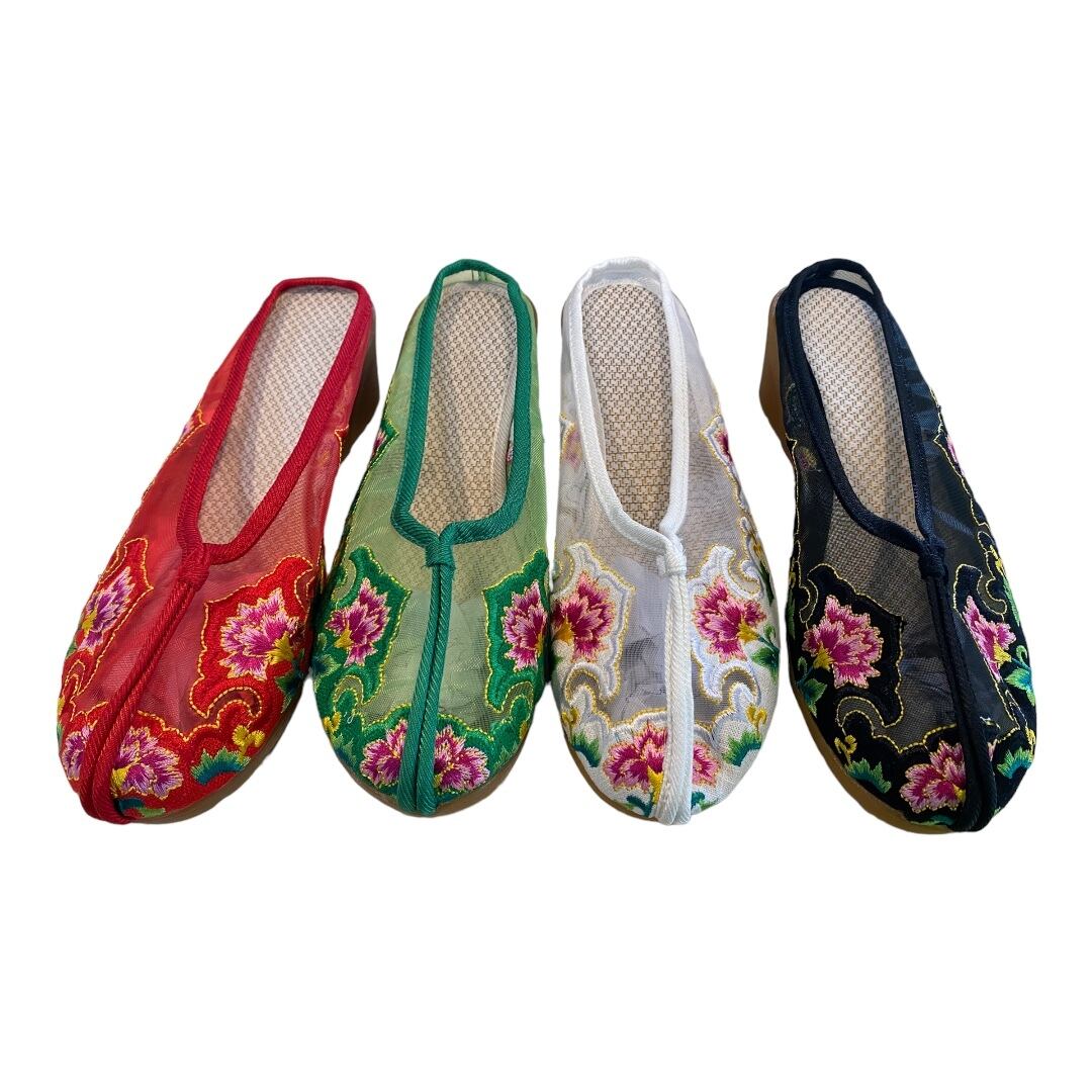カーネーション刺繍の透け感のあるキュートなチャイナシューズです。