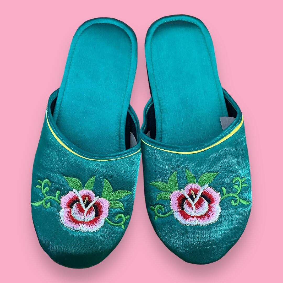 キッチュでキュートな刺繍のサテンのルームシューズです。